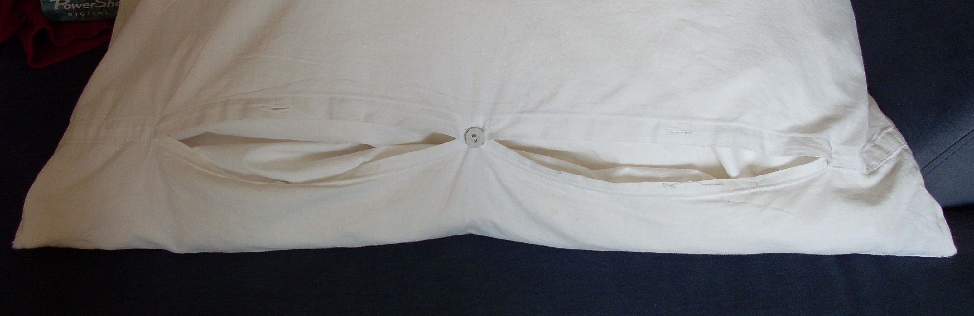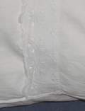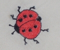 Baumwollbezug in der Größe ca. 77 x 72cm in weiß. Im oberen Drittel sollen als aufgenähte Applikation vier Marienkäfer (Durchmesser 2,5cm) krabbeln. Darunter soll ein Querstreifen in Spitzenstick über das Kissen angebracht sein. Das Loch auf der Rückseite sollte mit drei baumwollbezogenen Knöpfen zu schließen sein. Gerne Biobaumwolle.