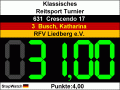 aufgebaut und deren Funktionen vereinen, d.h. sowohl die Zeit zwischen Lichtschranke 1 und 2, sowie wahlweise auch zwischen 2 und 3 messen und ausgeben, sowohl in die vorher eingelesene dbase-Datei als auch separat auf einen 2. Monitor (vgl. Stopwatch). Unabdingbar ist eine laufende Logdatei, die alle Aktivitäten der einzelnen Lichtschranken protokoliert und deren Log-Einträge man mittels Drag-und Drop (o.ä.) verwenden kann, z.B. falls aus Versehen eine Lichtschranke nicht ‚scharf‘ geschaltet wurde. Die Ausgabe auf einen extrenen Bildschirm soll dabei aber umfangreicher sein, es muß ein seperater Bereich für z.B. ein Sponsorenlogo wahlweise konfigurierbar sein. Die Ausgabe sollte auf einen 2. Monitor an einer Dual-Head-Karte (z.B. Matrox) als auch über einen 2. Rechner mittels eines ‚Clients‘ erfolgen. Über die Hauptsoftware soll dieser Client z.B. auch Videosequenzen wiedergeben können, die jedoch lokal auf dem Client gespeichert sind. In der Rubrik ‚Dressur‘ soll keine Zeit, dafür aber bis zu 5 Wertnoten je Starter eingegeben und wie unter der Rubrik ‚Springen‘ ausgegeben werden.