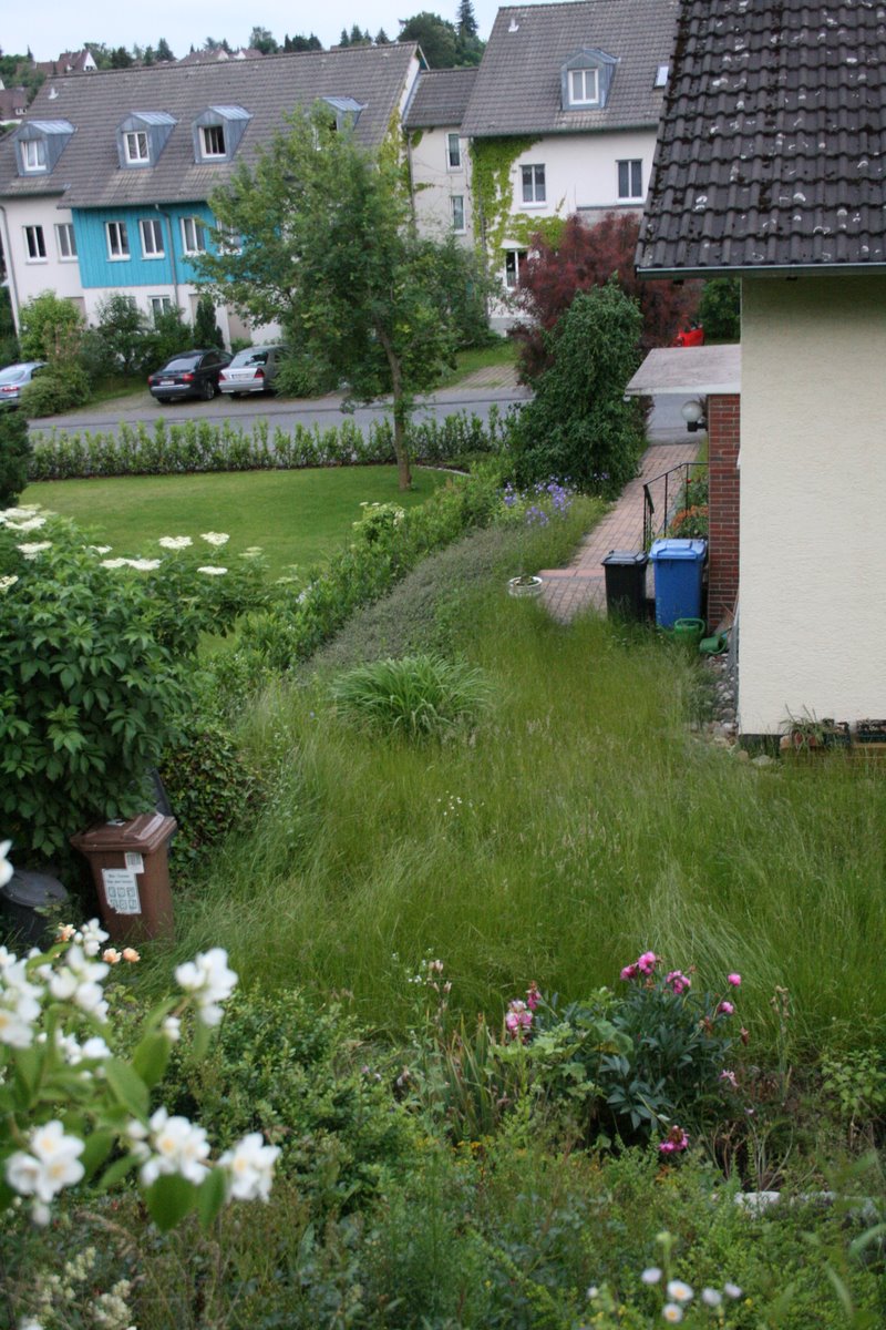 Der Rasen wurde seit einiger Zeit nicht mehr gemäht und ist recht hoch. Einiges Unkraut darin steht ca. 1 m hoch. Zur Strasse hin müsste die Hecke getrimmt werden, vor und hinter dem Haus müssen die Rasenflächen gemäht und ggf. etwas Unkraut aus den Beeten entfernt werden.