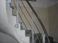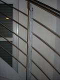 Die Treppe geht vom EG ins OG, hat 14 Kassettenstufen und Innen- und Außengeländer. An diesem Geländer müssen nur die Doppelpfosten aus Stahlblech und die Stutzenbleche für die Befestigung an den Wangen gestrichen werden. Der Handlauf und die Zwischengurte sind aus Edelstahl und werden nicht gestrichen. Die Kellertreppe ist aus Beton und hat nur die gleichen Doppelpfosten, die gestrichen werden müssen. Im OG enden die Geländer in eine Galerie die baugleich wie die Treppengeländer erstellt ist. Die Galerie ist stirnseitig mit einer Stahlblechblende abgeschlossen an der die Brüstungsgeländer angeschweißt sind. Auch dieses Blech muss gestrichen werden. Das Treppenloch KG/EG ist auch mit einer Stahlschürze verkleidet, die gestrichen werden muss.