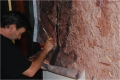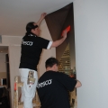 Arbeitsabfolge: Wand kurz säuern, Ausmessen (mit Laser, kein Stift darf auf die Wand), Kleber mit Rolle auf die Wand (Metylan Secura), Auftragen des Materials mit Kunststoffplatte (kein Besen), Überstehendes Abschneiden, nochmal komplett mit verdünntem Kleber überstreichen.