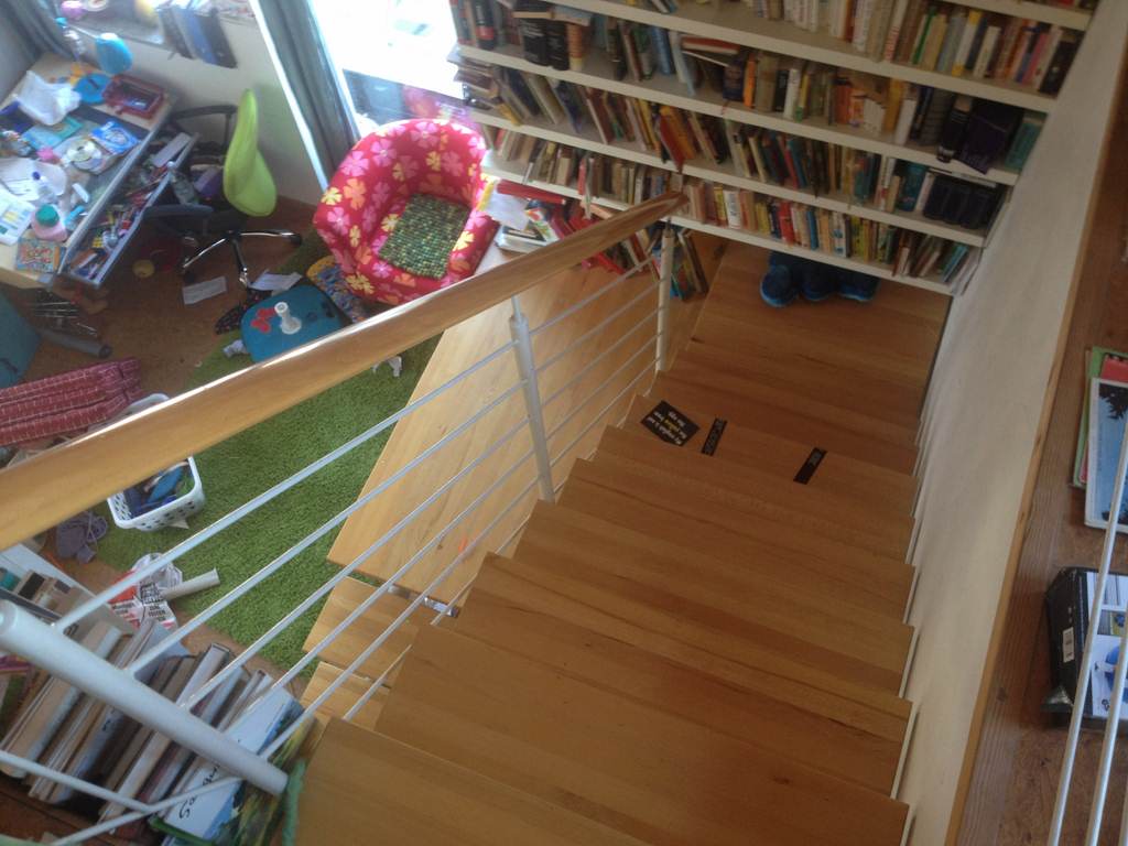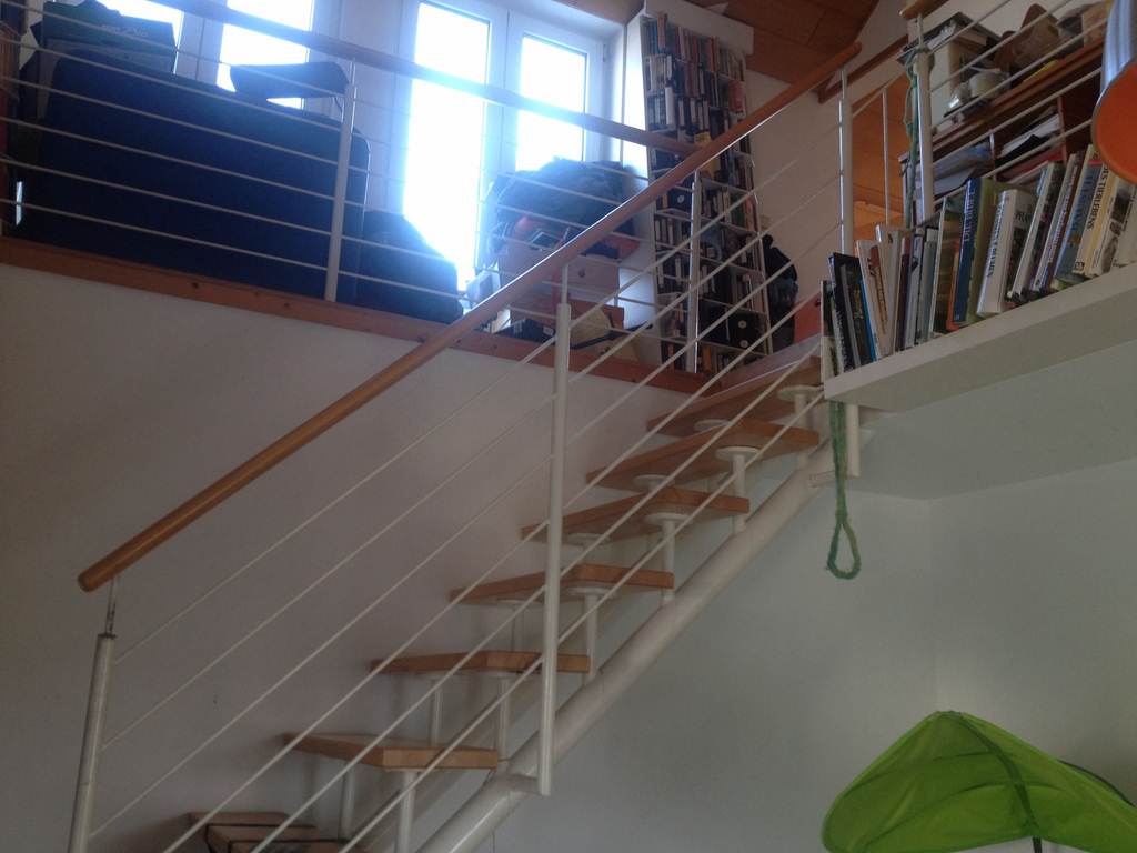Es könnte auch über das Geländer der Trappe nach unten gelassen werden mit entsprechender Ausrüstung. Am Ende der 10 Stufen vor der Linksdrehung muss es über das Geländer gehoben werden. Das Geländer ist nicht abmontierbar (der Handlauf schon). |