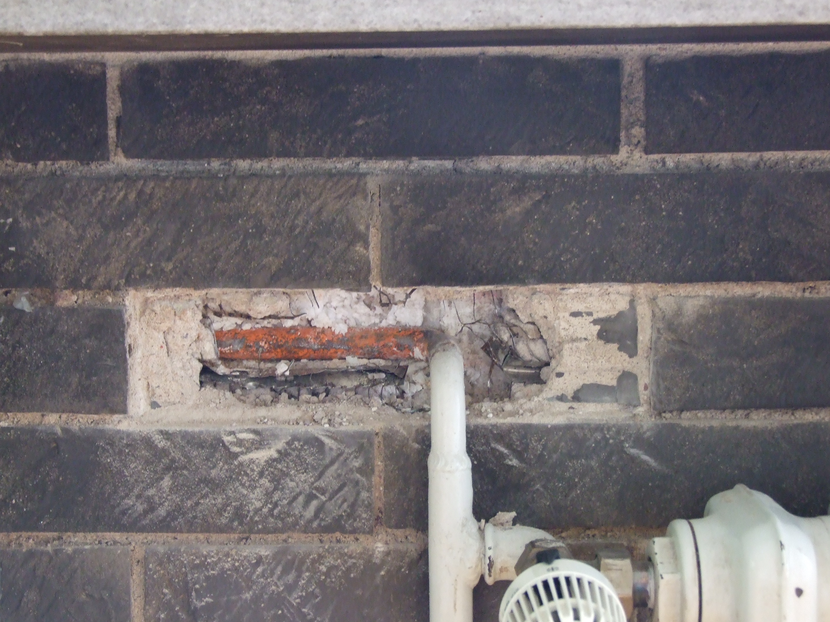 Die durchzuführenden Arbeiten sind: die Rohre mit Styropor umkleiden, Geflecht einlegen und mit Putz auffüllen. Anschließend die Reparaturstelle wo möglich mit ausgeschlagenem Klinker sonst mit neuem Ersatzklinker wieder verkleiden.