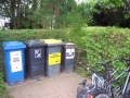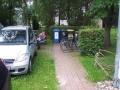 Der Fahrradständer soll dort stehen wo jetzt die Mülltonnen im Bild zu sehen sind. Er wird etwas breiter werden als die Hecke die hinter den Mülltonnen zu sehen ist.