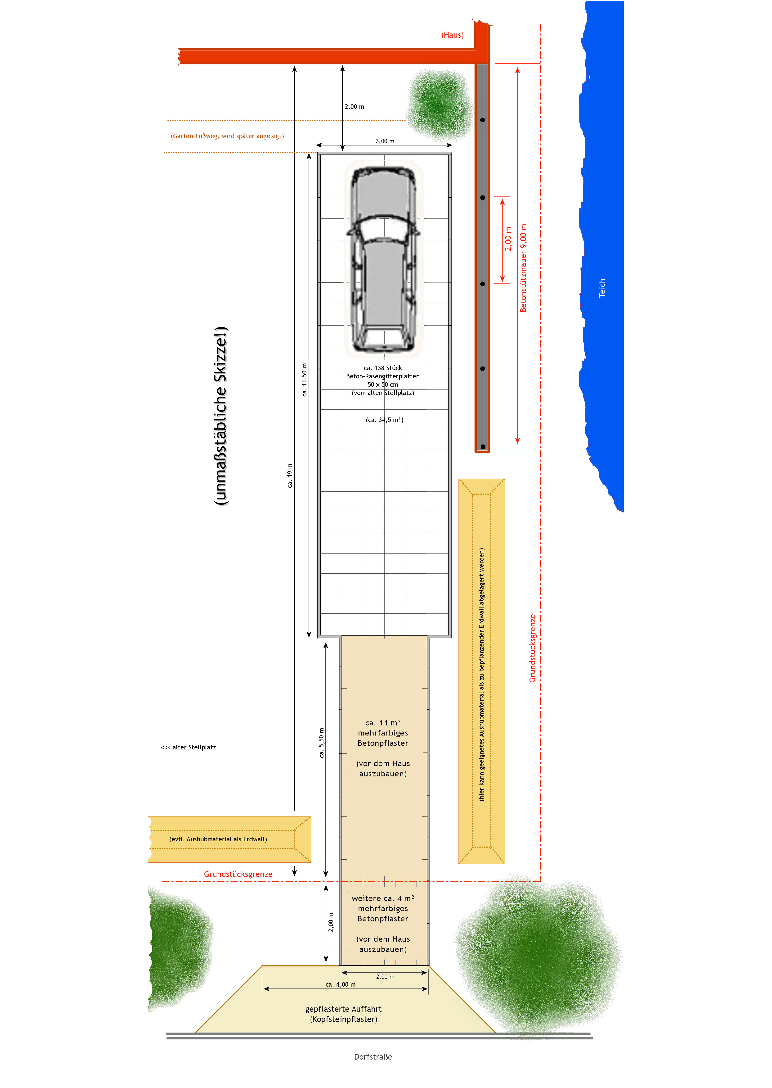 Ausbau von ca. 15 m² Betonpflaster vor dem Haus und direkter Wiedereinbau des Pflasters (ohne Zwischenlagerung) als Zufahrt von der bereits vorhandenen Kopfsteinpflaster-Einfahrt am Straßenrand bis zur neuen Stellplatzfläche.