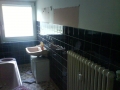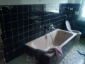 1 1 Fehlenden Putz und Estrich bei alter Badewanne aufputzen und ergänzen. Alte Sockelfliesen abstemmen und Schutt beseitigen.