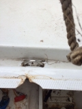 Am Heck gibt es mehrere Löcher von alten AB-Halterungen und anderen Anbauten. Diese müssten verfüllt werden (alles oberhalb der Wasserlinie). Realistischerweise wird das Heck nicht mehr wie neu werden, aber auch hier hoffe ich auf einen geduldigen Fachmann. An Deck sind 2 Stellen abgeplatzt bis auf das Laminat und müssen mit neuem Gelcoat versiegelt werden (weiß). Zudem ist der Haltepunkt für die Großschot mal ausgebrochen und muss dicht und stabil repariert werden.