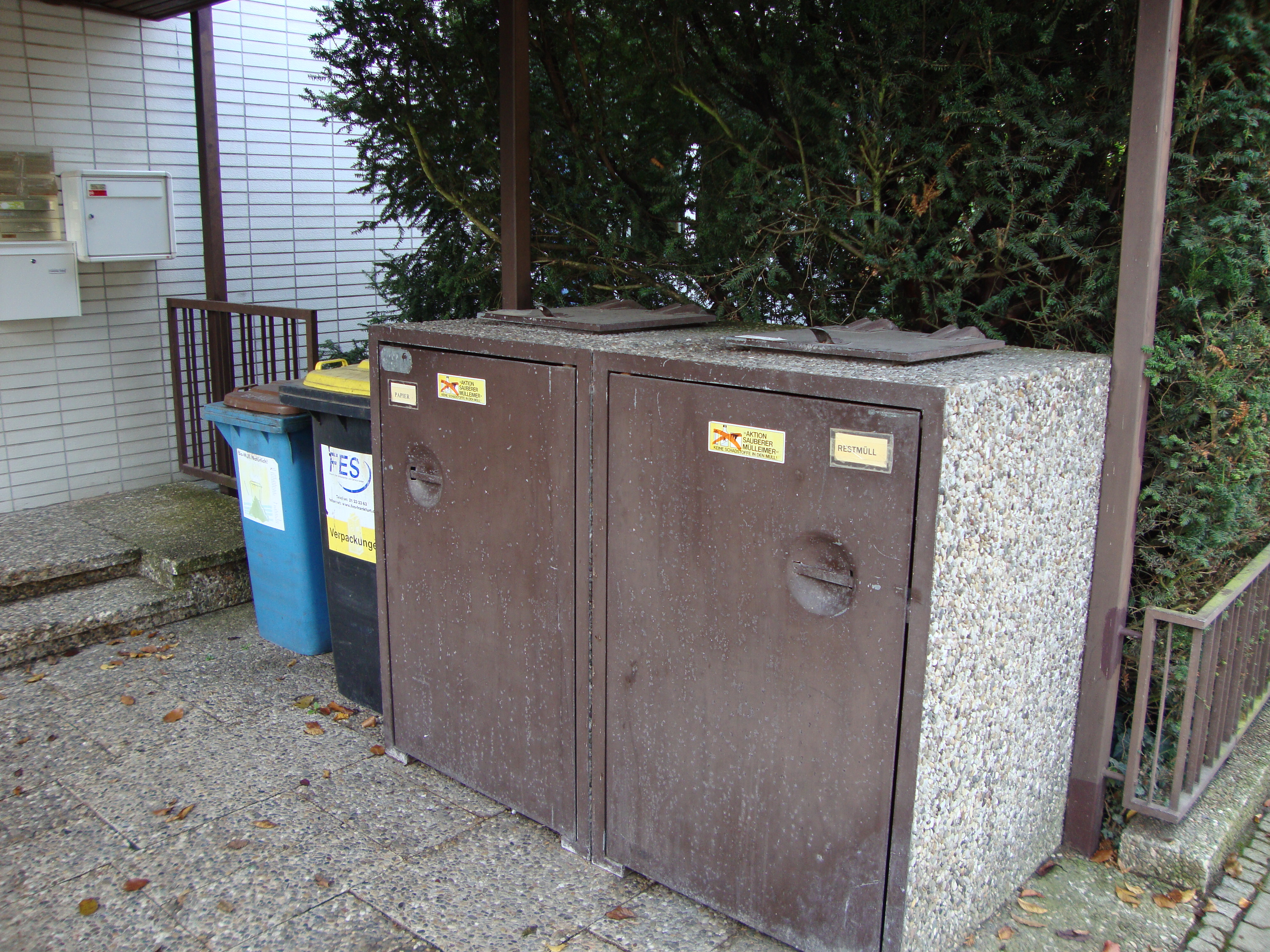 Entfernen und Entsorgung: Vorhandene Überdachung (ca. 2,6x3,5 m) aus Stahl inkl. Geländer, 2 St. Müllschränke, Bodenbelag aus Waschbetonplatten, 5 St. in-der-Wand Briefkasten.