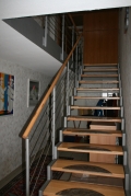 Objekt ist eine Innen-Treppenanlage mit Rundstahlpfosten, Holzhandlauf und zur Geländerfüllung vertikale Edelstahlstäbe, die in Bohrungen in die Rundstahlpfosten eingesetzt und verschweißt wurden.