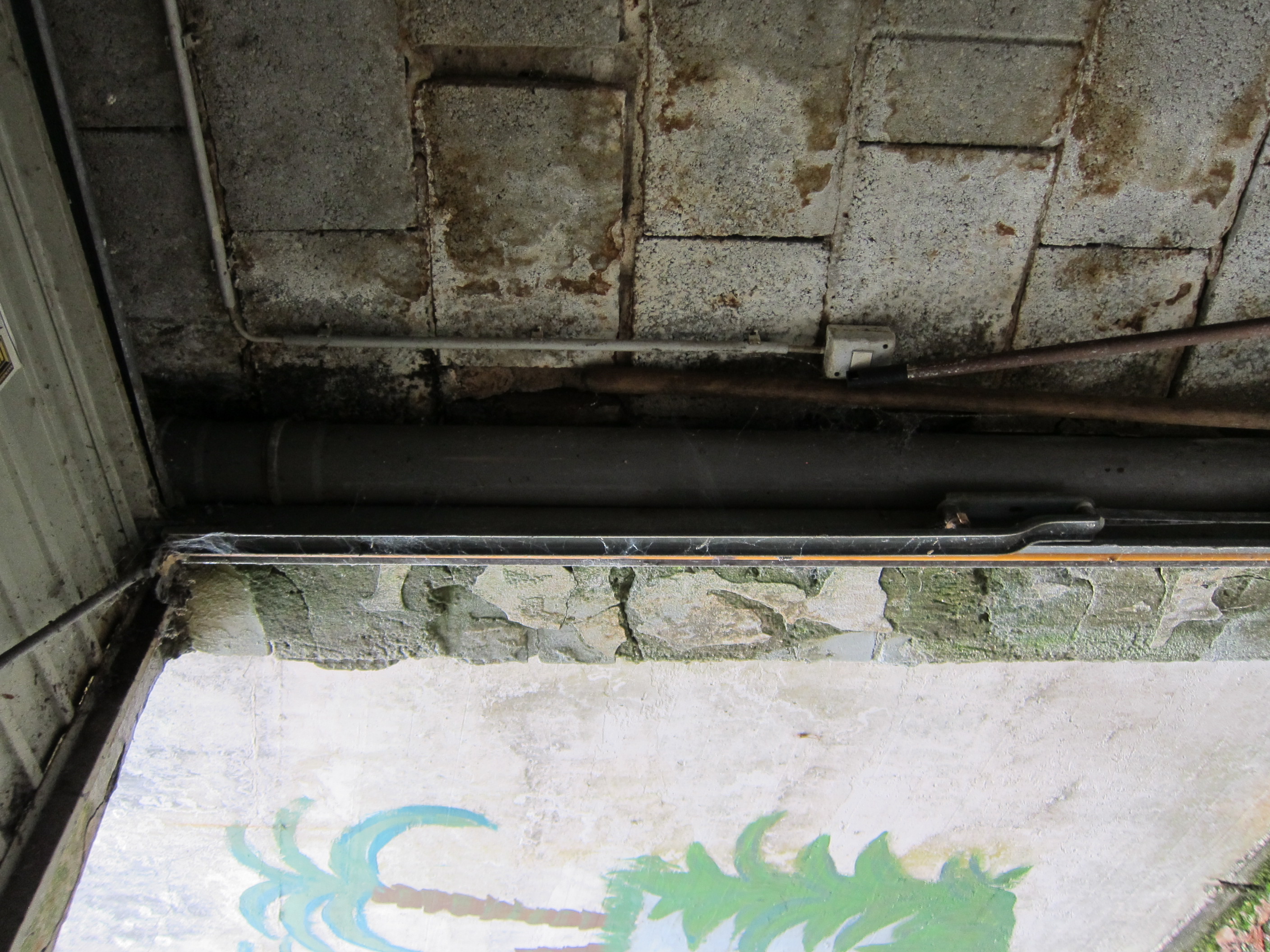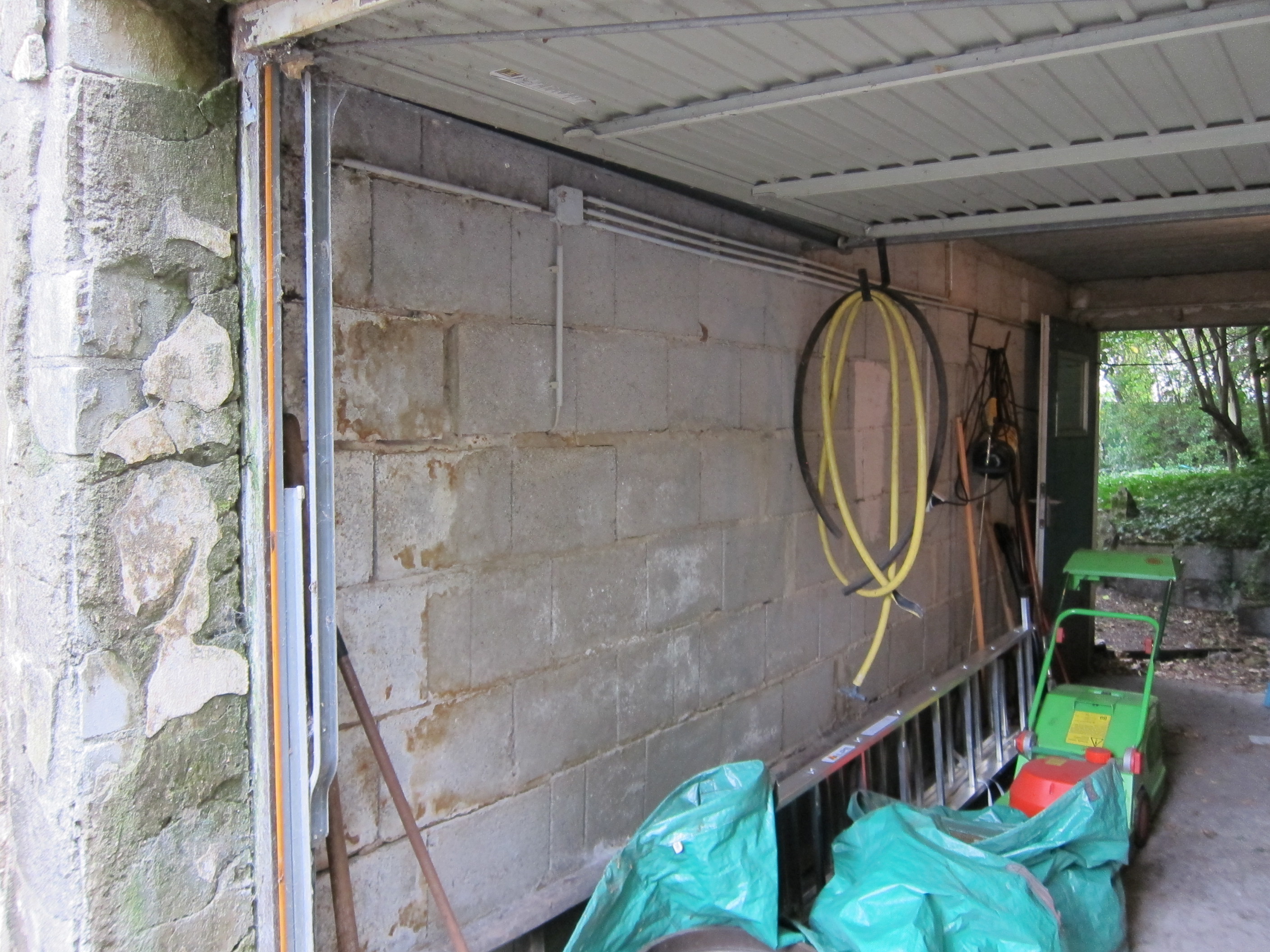 Bei unserer Garage tritt schon sein langem Feuchtigkeit ein, evtl. ist das Abflussrohr nicht ordentlich versiegelt, mindestens an einer Stelle ist die Dachpappe beschädigt. Die Folgeschäden sind abgebröckelter Außenputz und eine sehr häßliche Optik sowie Schimmelbildung innen an den unverputzten Steinen.