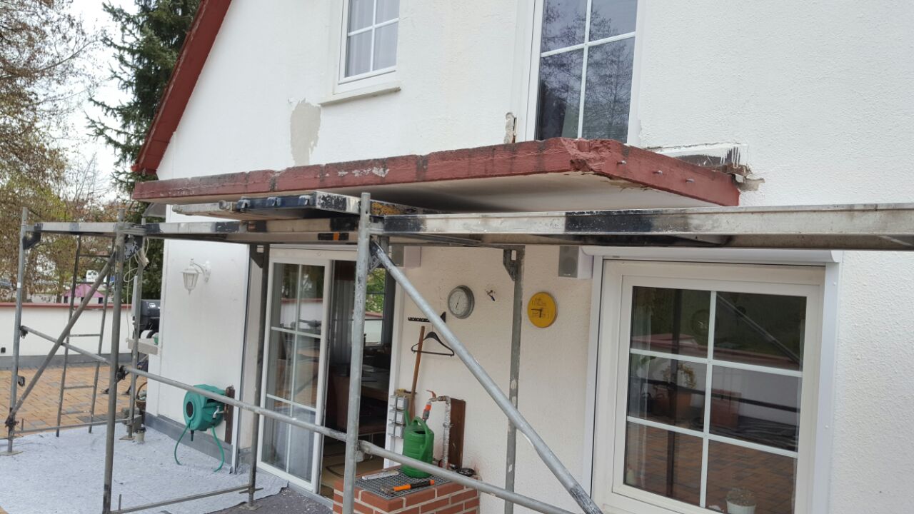 Abriss und Entsorgung von oben beschriebenen Balkons, Belag und Geländer sind bereits entfernt, sodass lediglich die frei schwebende Betonplatte abzubrechen ist.